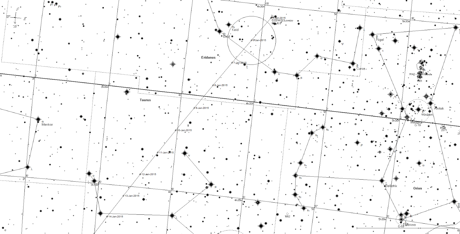 From around the 8th start your sweep at the saucepan it self, then from the 10th the comet is nestled between the legs of Taurus the Bull. Start your sweep at blue-white Bellatrix, the bright star below and to the north of the saucepan (not the bright red Betelgeuse below and to the south), towards the like of stars that marks Orion’s shield and then on further to a U shaped group of faintish stars, just above the obvious inverted “V” that is the head of Taurus. The “U” shape is where the comet will be at its brightest.