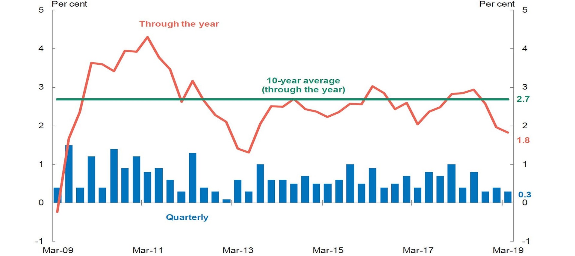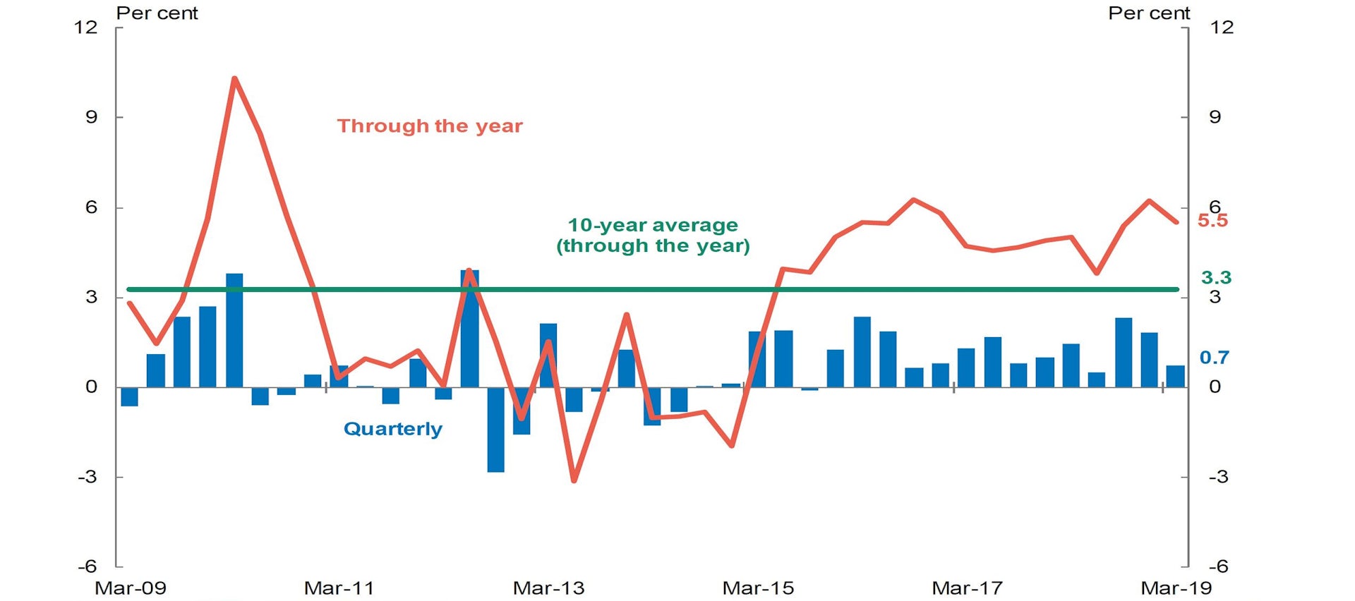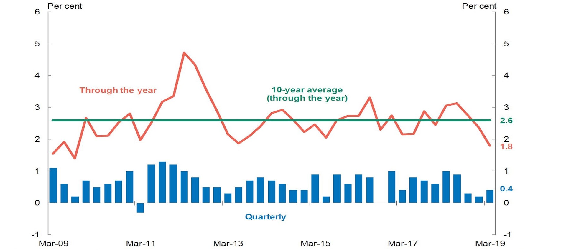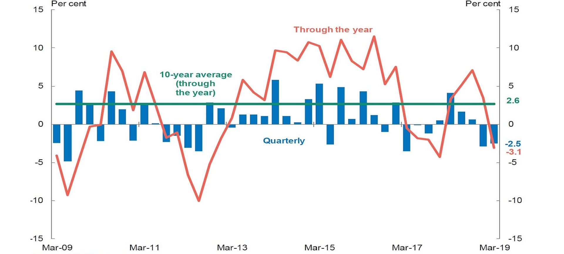 Low wages growth and falling housing prices are factors dampening consumption growth. The downturn in the housing market is also weighing on output growth through falling construction. In the March quarter it declined 2.5%, and was 3.1% lower over the year, a far cry from 10% plus annual growth rates achieved as recently as three years ago.